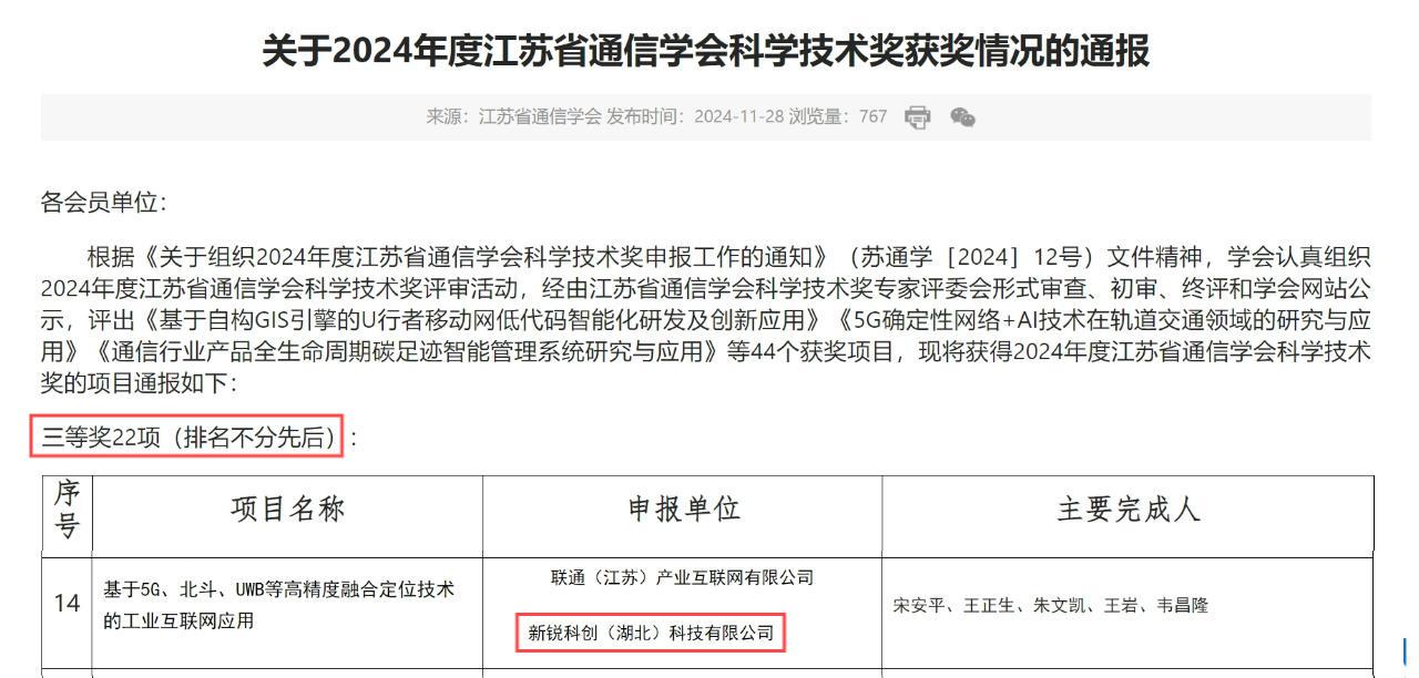 近日,江蘇省通信學會正式公布了2024年度江蘇省通信學會科學技術獎名單,新銳科創(湖北)科技有限公司攜手聯通(江蘇)產業互聯網有限公司,憑借“基于5G、北斗、UWB等高精度融合定位技術的工業互聯網應用”項目成功摘得三等獎。