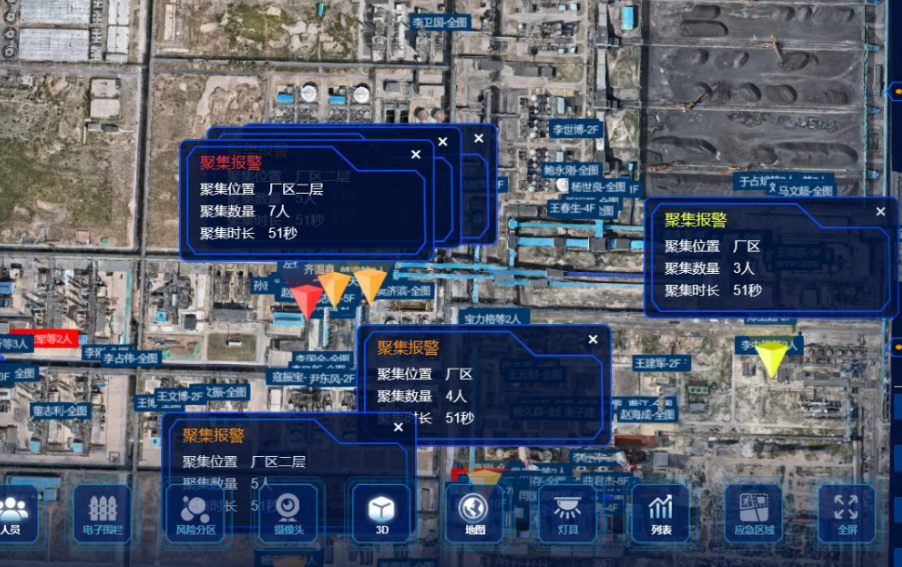 實時監測任意位置的聚集風險,展示人員聚集數量及人員信息清單,可根據人員聚集程度,進行不同等級預警。